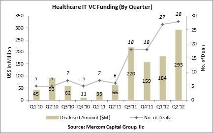 Venture Capital (VC) funding in the HIT sector continued to scale new heights reaching $293M in Q2 2012 in 28 deals. Both the total amount and the number of deals were at their highest levels since 2010.
