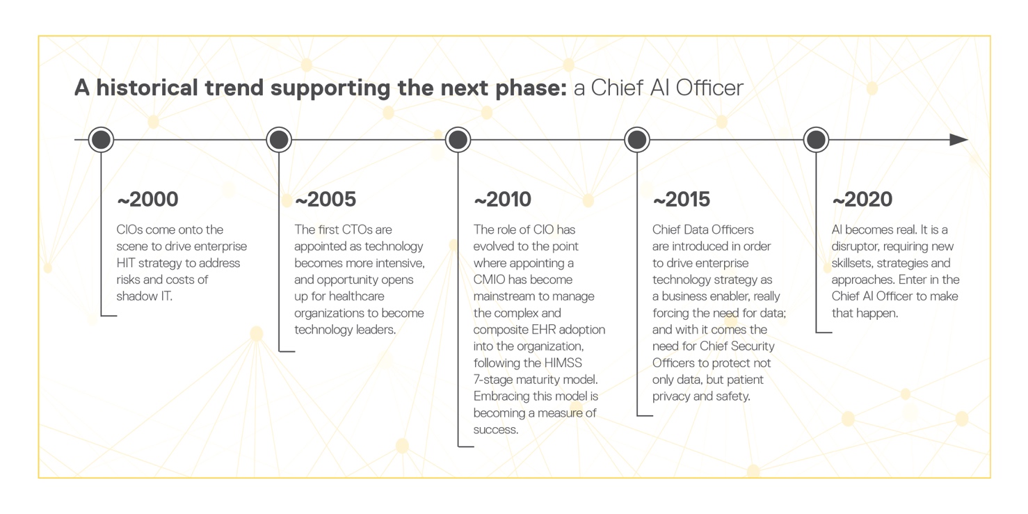 Sometimes, we need to look at past historical trend points to help us focus on what may be the next logical step in overcoming barriers in the future. In looking at the past progress in our industry, a recognition of the need for a cohesive enterprise strategy has driven healthcare organizations to appoint a CIO, CTO, Chief Data Officer, and then a Chief Security Officer to develop and realize the organization-specific vision and strategy for health IT (HIT), technology, data, and security, respectively (Figure 2).
