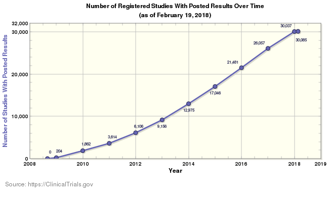 Figure 1. A good example of why AI is needed in healthcare — consider the number of registered studies that continue to accelerate year over year. Clinicians will likely need AI just to keep up with research in their own area of specialization. (Data sourced from ClinicalTrials.gov on February 19, 2018.)